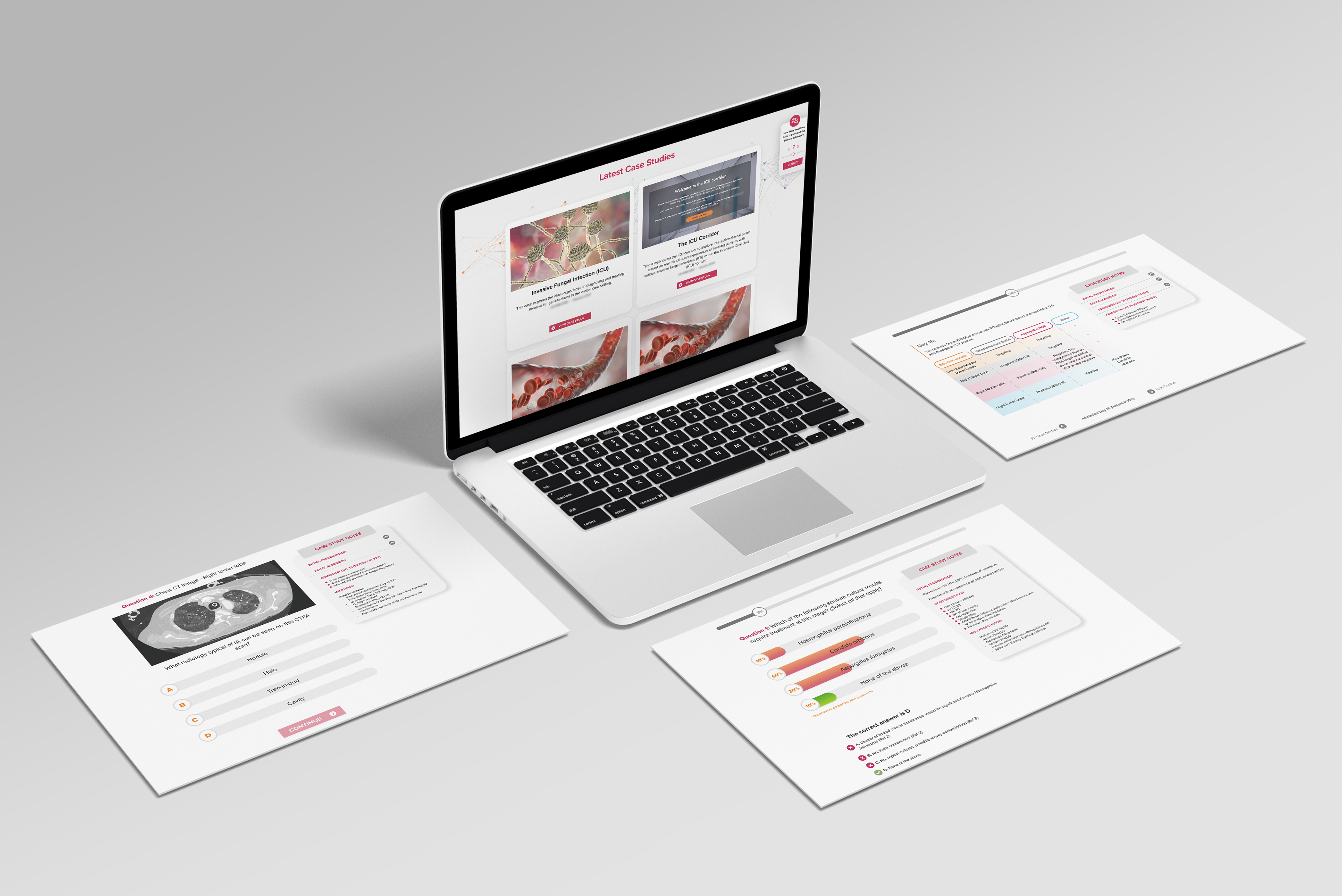 We created interactive case studies for healthcare professionals to deepen their understanding of a rare disease and the patient journey. Each case included engaging visuals, decision-making prompts, and contextual icons to enhance learning. As users progressed through the cases, they encountered multiple-choice decisions, which were tracked by the system. The platform provided analytics and explained the reasoning behind correct answers to support deeper understanding.
